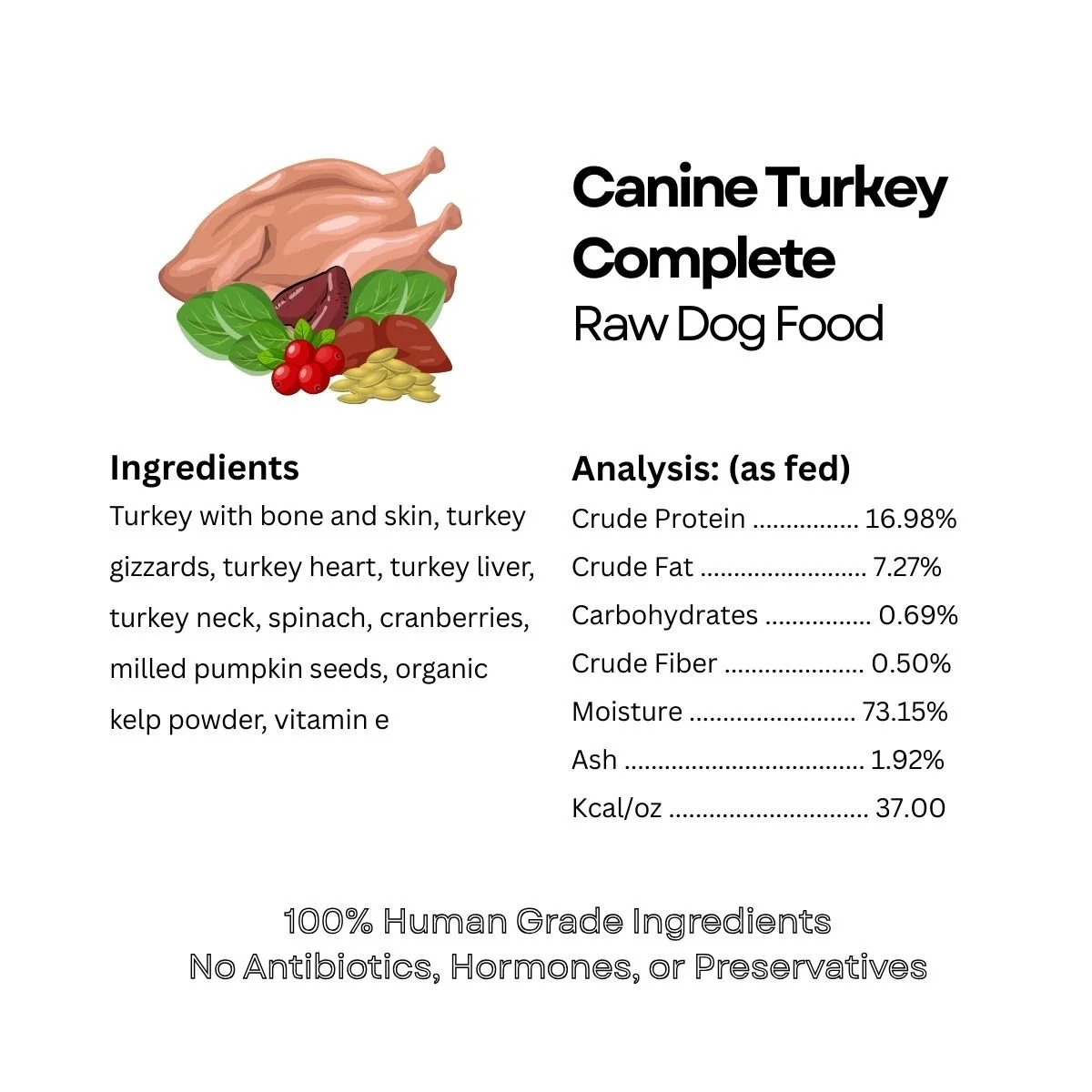 Ingredients: turkey with bone and skin, turkey gizzard, turkey heart, turkey liver, turkey neck, collard greens, cranberries, psyllium husk powder, wheat germ oil, organic kelp powder