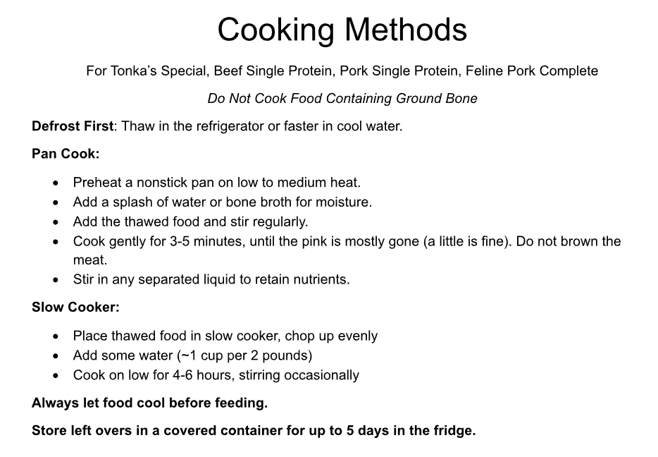 We do not recommend cooking meals that contain ground bone, as cooking may create a safety risk—especially for small pets. Although the bones are ground very finely, cooking can cause bone fragments to harden or become sharp. Raw bones are safe; cooked bones are not.